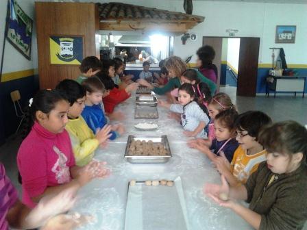 A avó Dores ficou encarregue da organização da lenha, algumas mães da recolha das ofertas e das restantes compras e outras das amassaduras. Logo pelas 09h já todos estavam prontos (alguns até dormiram mal tal era a excitação). Os alunos, acompanhados pelos professores, fizeram a caminhada até à Associação e lá os esperavam muitas mães e avós. Organizadas as “tropas” todos puseram as mãos na massa (literalmente falando) e ora fazendo bolinhas, ora pincelando, ora pondo nas cestas fizeram-se aproximadamente 60 kg de broas. Nesse dia pudemos contar também com as professoras Judite Adonis e Ana Paula Santos e ainda os professores das AEC. Aproveitámos a oportunidade para falar de matemática e de noções como grama, kg, ml. e tivemos até tempo de trabalhar a consciência fonológica e fazer jogos .