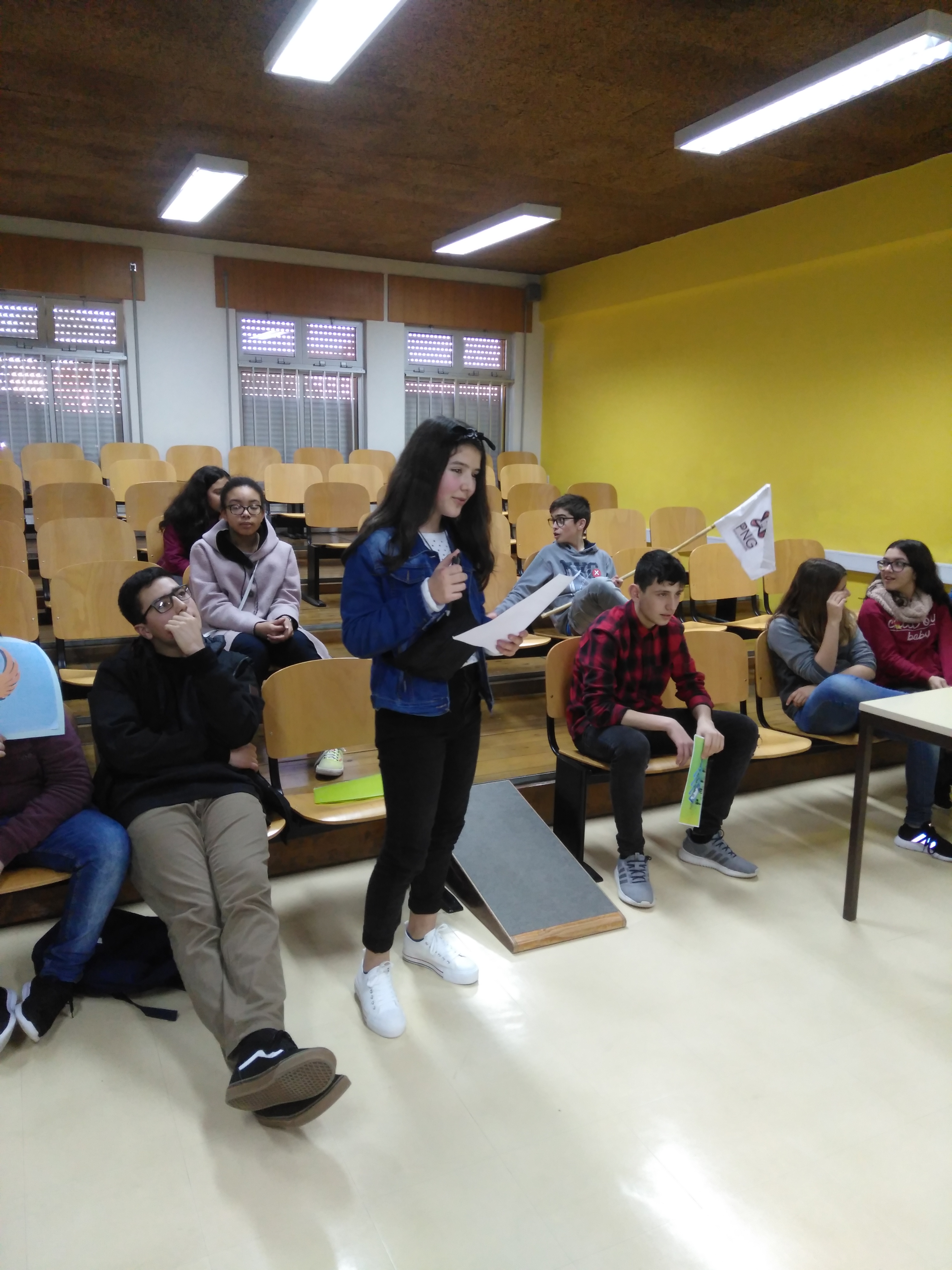 Depois do estudo dos principais órgãos de soberania, feito através de atividades de pesquisa sobre o processo de eleição, funcionamento e poderes de cada um, os alunos foram convidados a simular um debate na Assembleia da República.  O tema escolhido foi o uso dos telemóveis na escola: o partido A era favor da proibição do uso do telemóvel em todos os espaços escolares, o partido B defendia o uso do TM no recreio e a sua proibição nas aulas e o partido C defendia a liberdade da utilização do TM em todos os locais da escola. Antes de iniciarem a preparação do debate, os diferentes grupos escolheram o nome, o logotipo e a bandeira do respetivo partido. Apareceram alguns nomes bastante sugestivos, como foi o caso, em uma das turmas, do PNG – Partido de que Ninguém Gosta – tratava-se obviamente de defensores da proibição dos telemóveis na escola.