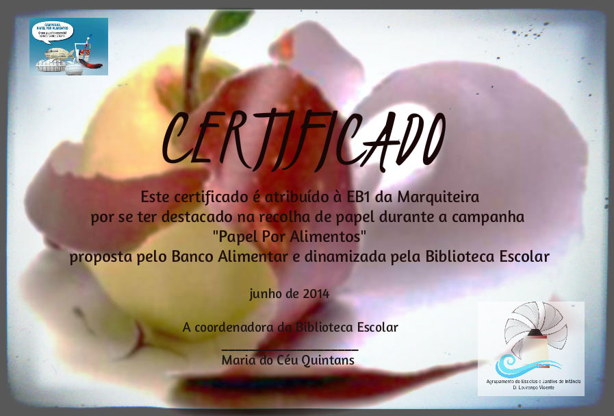 Em outubro de 2013, as Bibliotecas Escolares, em parceria com o Banco Alimentar do Oeste, assinalaram o Dia Mundial da Alimentação lançando um desafio aos alunos e suas famílias. Este teve como objetivo sensibilizar para o desenvolvimento sustentável e formar as crianças e os jovens em práticas simples de participação cívica. Com o envolvimento de todos foi possível juntar 3,5 toneladas de papel na EB c/ JI de Ribamar (entregues no ponto de recolha pela Junta de Freguesia da Atalaia/Lourinhã) que equivalem a 350 euros em alimentos distribuídos pelo Banco Alimentar do Oeste a instituições do concelho.