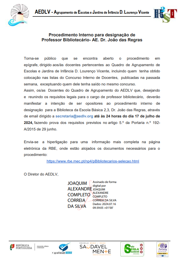 Procedimento Interno para designação de Professor Bibliotecário- AE. Dr. João das Regras por Prof. Isabel Mergulhão Dias - Tuesday, 16 de July de 2024 às 12:17 Número de respostas: 0 Hiperligação permanente