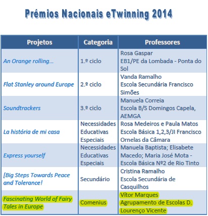 O projeto “Fascinating World of Fairy Tales in Europe”, desenvolvido pelo Agrupamento de Escolas D. Lourenço Vicente, Lourinhã, durante os anos letivos 2012/2013 e 2013/2014 é o vencedor do Prémio Nacional "eTwinning 2014", na categoria Comenius.