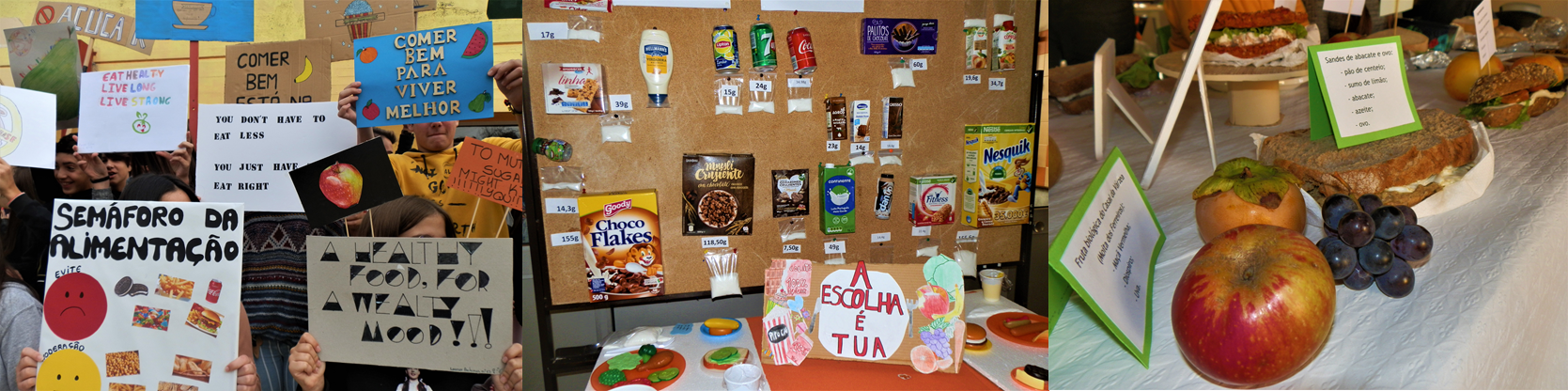 As temáticas da disciplina de Ciências Naturais (CN) do 2º e 3º ciclo sobre a alimentação saudável e do projeto Erasmus+ “Sugar? No, thanks!” sobre os riscos do consumo excessivo de açúcar nos alimentos do dia-a-dia encontraram eco no tema escolhido, este ano, pela FAO, para o Dia Mundial da Alimentação e que apela à necessidade de ações mais ousadas para incentivar dietas mais saudáveis e sustentáveis. Debruçando-se sobre estes temas, as turmas do 9º ano, na disciplina de CN, procuraram alguns dos seus alimentos preferidos, analisaram rótulos, fizeram cálculos e viram que, em todos eles, a quantidade de açúcar era assustadoramente superior ao recomendado para se viver bem. No dia 16 de outubro, os resultados foram expostos, em grandes painéis, no átrio central da Escola de Ribamar com o objetivo de chamar a atenção para esta problemática. Neste dia, para o lanche da manhã, quiseram mostrar que podiam fazer diferente e trouxeram fruta, sandes originais e saudáveis, procurando usar produtos locais, da época, sem embalagens de plástico e sem açúcar adicionado, o que resultou numa grande mesa cheia de cor e bons sabores. O intervalo foi ainda marcado por uma “manifestação pacífica”, com cartazes criativos, para partilhar com todos o apelo urgente para uma mudança de hábitos com vista a viver um futuro com menos doenças e mais qualidade de vida.